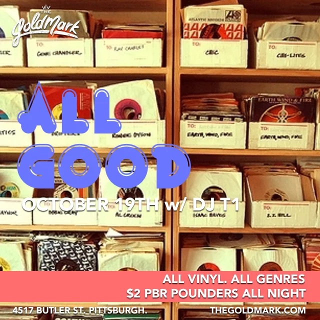 ALL GOOD W/ DJ T1 Wednesday, October 19, 2016 10:00 PM 11:59 PM 22:00 23:59 Google Calendar ICS ALL GOOD W/ DJ T1EVERY THIRD WEDNESDAY OF THE MONTHALL VINYL. ALL GENRES.DRINK SPECIALS$2 PBR POUNDERS ALL DAY