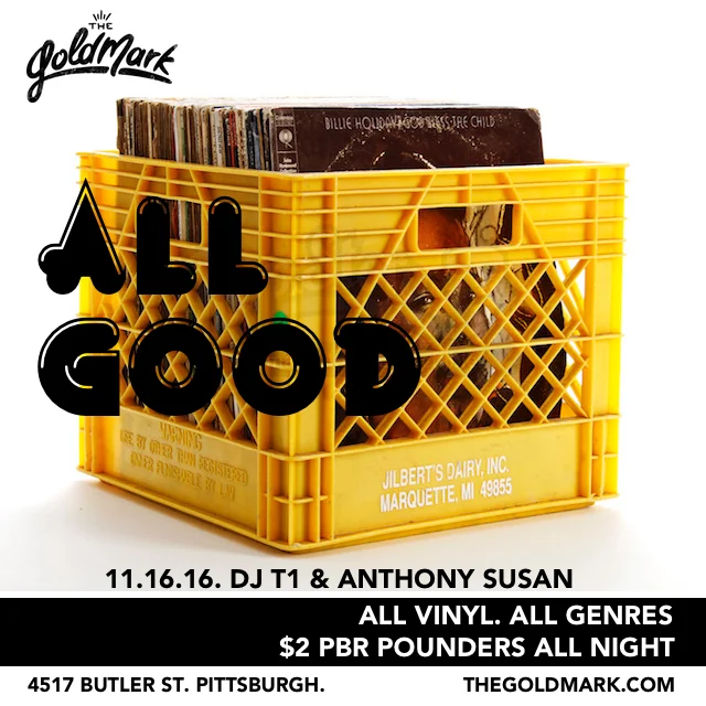 ALL GOOD W/ DJ T1 & ANTHONY SUSAN Wednesday, November 16, 2016 10:00 PM 11:59 PM 22:00 23:59 Google Calendar ICS ALL GOOD W/ DJ T1EVERY THIRD WEDNESDAY OF THE MONTHALL VINYL. ALL GENRES.DRINK SPECIALS$2 PBR POUNDERS ALL DAY