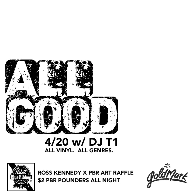 "ALL GOOD" W/ DJ T1 Wednesday, April 20, 2016 10:00 PM 11:59 PM 22:00 23:59 Google Calendar ICS ALL GOOD W/ DJ T1ALL VINYL. ALL GENRES.10PM. NO COVERSPECIALS - $2 PBR POUNDERS ALL NIGHT
