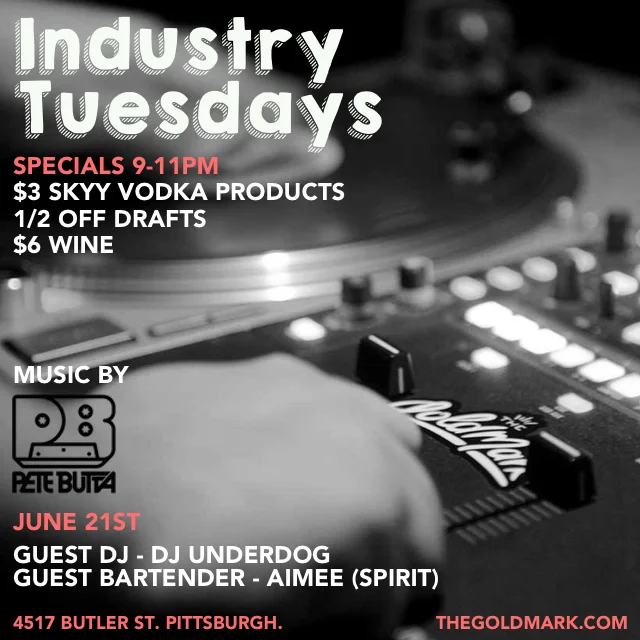 INDUSTRY TUESDAYS W/ PETE BUTTA & GUESTS Tuesday, June 21, 2016 10:00 PM 11:59 PM 22:00 23:59 Google Calendar ICS INDUSTRY TUESDAYS W/ PETE BUTTA & GUESTSDRINK SPECIALS 9-11PM#3 SKYY VODKA PRODUCTS, $6 WINE, 1/2 OFF DRAFTSNO COVER