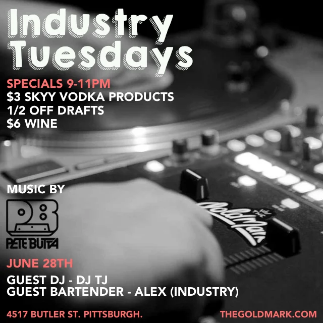 INDUSTRY TUESDAYS W/ PETE BUTTA & GUESTS Tuesday, June 28, 2016 10:00 PM 11:59 PM 22:00 23:59 Google Calendar ICS INDUSTRY TUESDAYS W/ PETE BUTTA & GUESTSDRINK SPECIALS 9-11PM#3 SKYY VODKA PRODUCTS, $6 WINE, 1/2 OFF DRAFTSNO COVER
