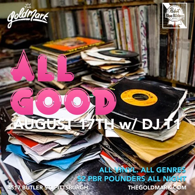 ALL GOOD W/ DJ T1 Wednesday, August 17, 2016 10:00 PM 11:59 PM 22:00 23:59 Google Calendar ICS ALL GOOD W/ DJ T1EVERY THIRD WEDNESDAY OF THE MONTHALL VINYL. ALL GENRES.DRINK SPECIALS$2 PBR POUNDERS ALL DAY