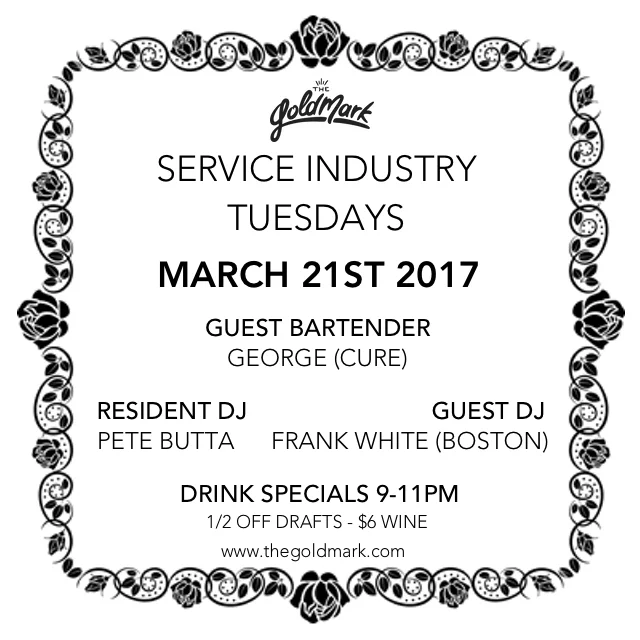 SERVICE INDUSTRY TUESDAYS W/ PETE BUTTA & GUESTS Tuesday, March 21, 2017 9:00 PM 11:59 PM 21:00 23:59 Google Calendar ICS SERVICE INDUSTRY TUESDAYS W/ PETE BUTTA & GUESTSTRUST THE DJ 9PM-2AMDRINK SPECIALS 9-11PM1/2 OFF DRAFTS + $6 WINE