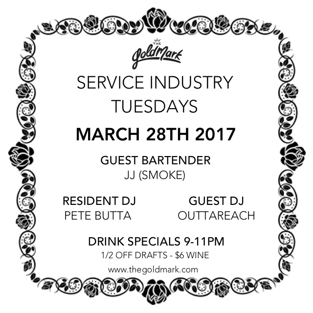 SERVICE INDUSTRY TUESDAYS W/ PETE BUTTA & GUESTS Tuesday, March 28, 2017 9:00 PM 11:59 PM 21:00 23:59 Google Calendar ICS SERVICE INDUSTRY TUESDAYS W/ PETE BUTTA & GUESTSTRUST THE DJ 9PM-2AMDRINK SPECIALS 9-11PM1/2 OFF DRAFTS + $6 WINE