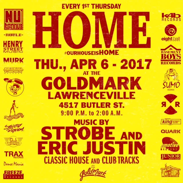 1ST THURSDAYS OF THE MONTH ARE THE "HOME" FOR HOUSE MUSIC.  EVERY MONTH LEGENDARY PITTSBURGH HOUSE MUSIC PRODUCER/DJ STROBE AND ERIC JUSTIN (FORMER OWNER OF THE FAMED HYPERVINYL RECORDS) TAKE YOU ON A JOURNEY BACK THROUGH TIME WITH  CLASSIC HOUSE RECORDS AND CLUB TRACKS.  DANCING SHOES ARE A MUST.
