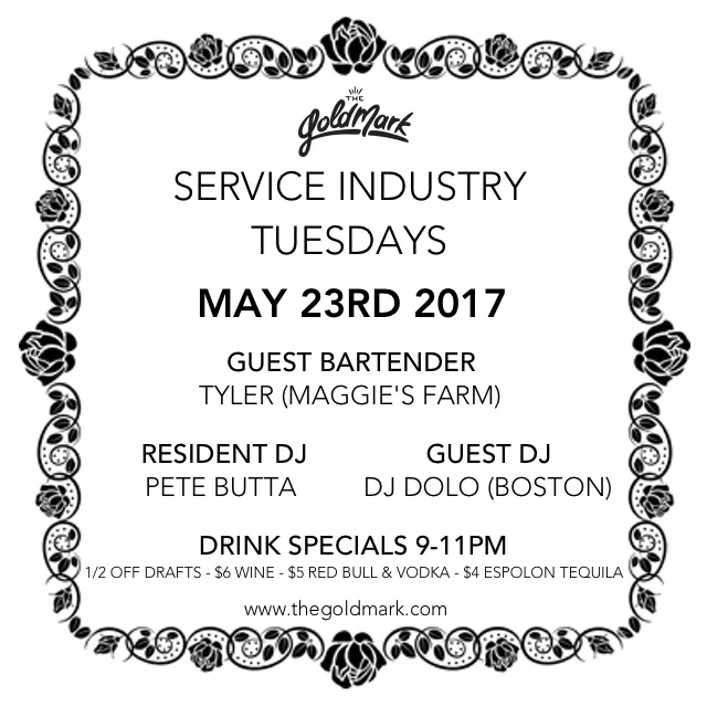 EVERY TUESDAY NIGHT IS SERVICE INDUSTRY NIGHT AT THE GOLDMARK.  RESIDENT DJ PETE BUTTA IS JOINED BY GUEST DJs FROM AROUND THE CITY AS WELL AS DIFFERENT GUEST BARTENDERS TO KEEP THINGS INTERESTING.