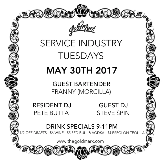 EVERY TUESDAY NIGHT IS SERVICE INDUSTRY NIGHT AT THE GOLDMARK.  RESIDENT DJ PETE BUTTA IS JOINED BY GUEST DJs FROM AROUND THE CITY AS WELL AS DIFFERENT GUEST BARTENDERS TO KEEP THINGS INTERESTING.