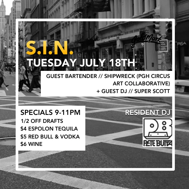 EVERY TUESDAY NIGHT IS SERVICE INDUSTRY NIGHT AT THE GOLDMARK.  RESIDENT DJ PETE BUTTA IS JOINED BY GUEST DJs FROM AROUND THE CITY AS WELL AS DIFFERENT GUEST BARTENDERS TO KEEP THINGS INTERESTING.