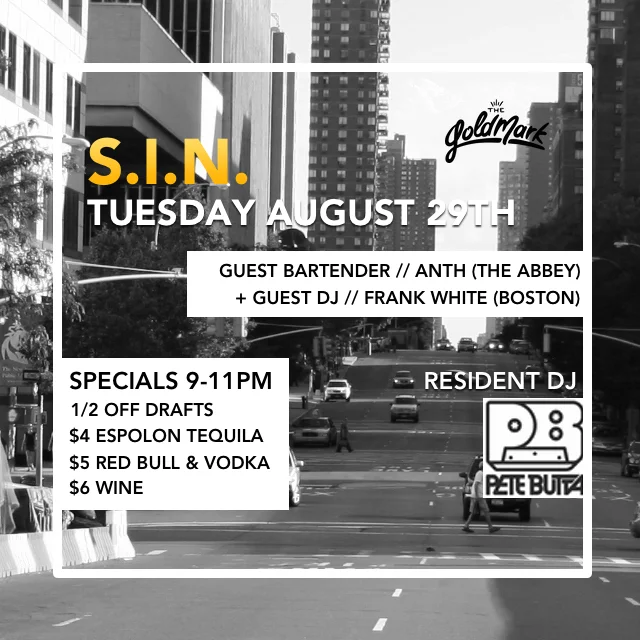 EVERY TUESDAY NIGHT IS SERVICE INDUSTRY NIGHT AT THE GOLDMARK. RESIDENT DJ PETE BUTTA IS JOINED BY GUEST DJs FROM AROUND THE CITY AS WELL AS DIFFERENT GUEST BARTENDERS TO KEEP THINGS INTERESTING.