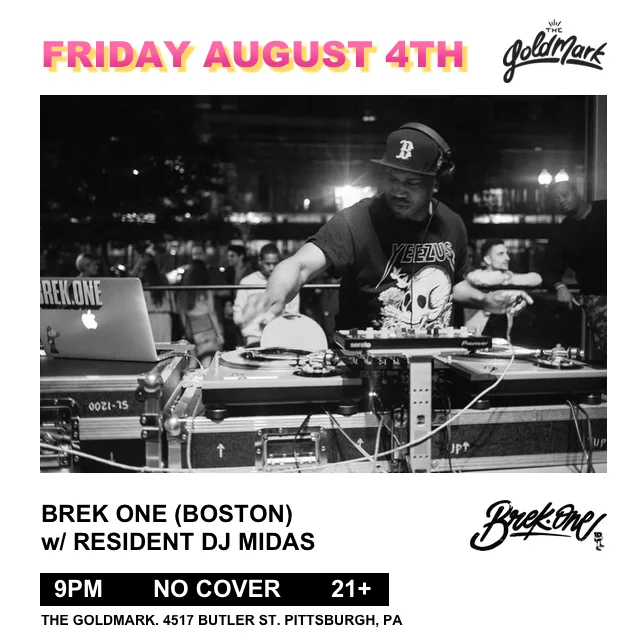 DJ MIDAS HAS BEEN HOLDING DOWN THE DJ BOOTH AT PITTSBURGH'S BEST DANCE ESTABLISHMENTS FOR OVER A DECADE AND GRACES THE DECKS AT THE GOLDMARK EVERY FRIDAY NIGHT. EXPECT TO HEAR ANYTHING AND EVERYTHING DANCEWORTHY. FRIDAY NIGHT AUGUST 4TH WE ALSO WELCOME ONE OF BOSTON'S MOST NOTORIOUS PARTY ROCKERS, BREK ONE.